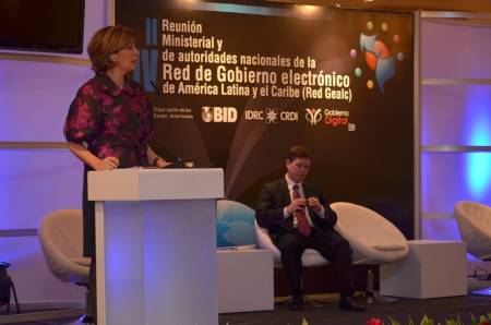 Mayi Antillón, Ministra de Economía, Industria y Comercio, Costa Rica, moderadora de la presentación del keynote speaker, Kenneth J Cochrane, ex CIO del gobierno de Canadá, quien espera en el escenario. La ponencia de Cochrane se tituló "From e-Government to the Digital Economy".