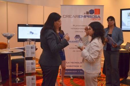 Durante la pausa del café de la primera mañana, Ana López Grijalva, directora de e-gobierno de Ecuador, se interioriza de la solución Crearempresa de Costa Rica en la zona de stands.