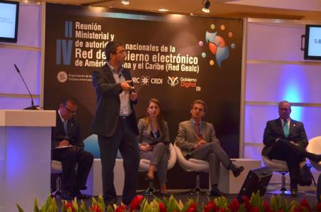 Paolo Valenti, Especialista Leader en Gestión de Gobierno electrónico del BID presenta "Desafíos de gestión y de participación ciudadana en el gobierno electrónico de América Latina". En el escenario, de izquierda a derecha, Rowland Espinosa, Viceministro de Telecomunicaciones de Costa Rica; Johanna Pimiento, Directora del Programa Gobierno en línea de Colombia; el moderador Néstor Bercovich de Cepal; y Eduardo Jaén, Ministro de la Autoridad Nacional para la Innovación Gubernamental de Panamá.